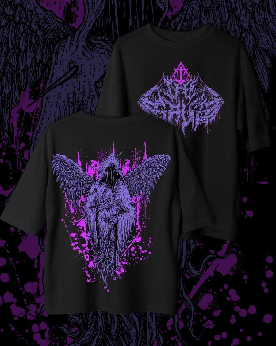 Drenched in piercing violet and pain, this hooded phantom floats between realms. Wings torn, body pierced, yet power undimmed. A spectral masterpiece for those drawn to the poetic violence of life’s darker beauty, where elegance meets absolute annihilation. Wear it and haunt back.