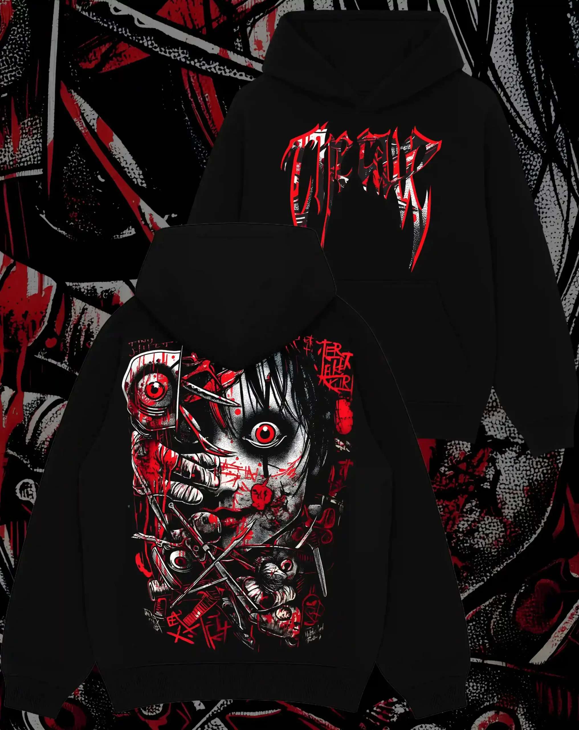 This chaotic, manga-inspired piece dives deep into madness with handcrafted linework and blood-red ink hits. It’s made to turn heads—and haunt them. A wearable collector’s item built from premium heavyweight fabric.