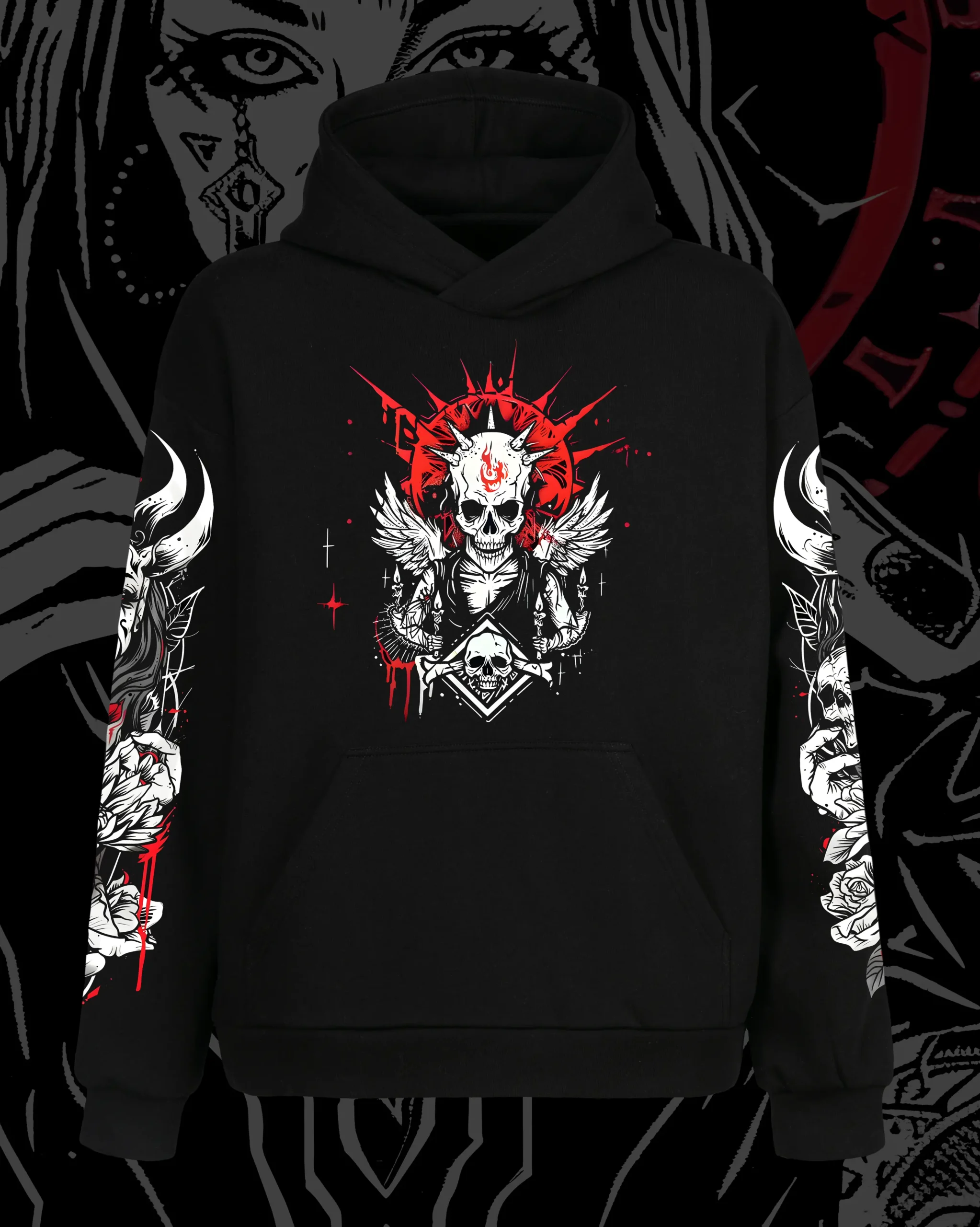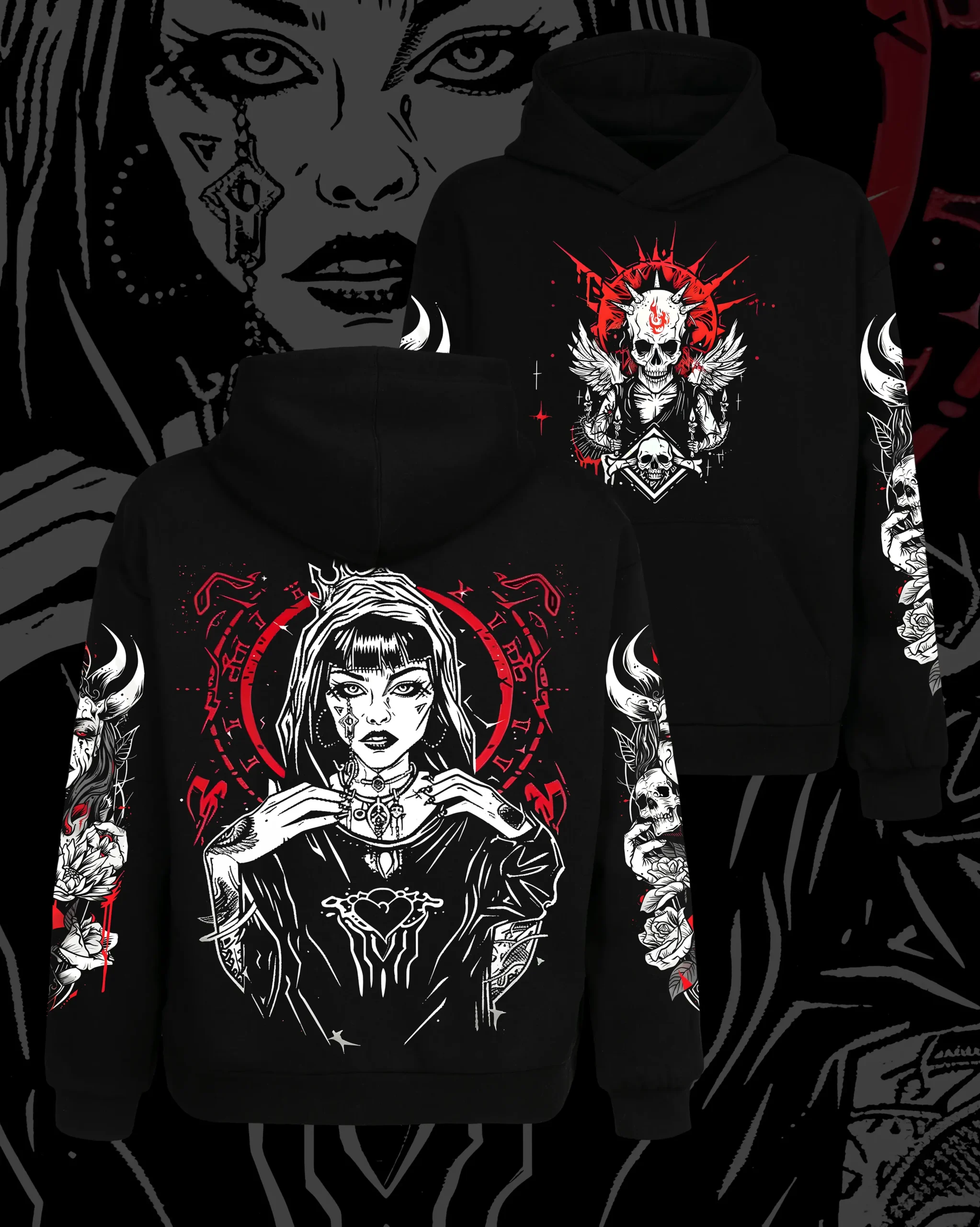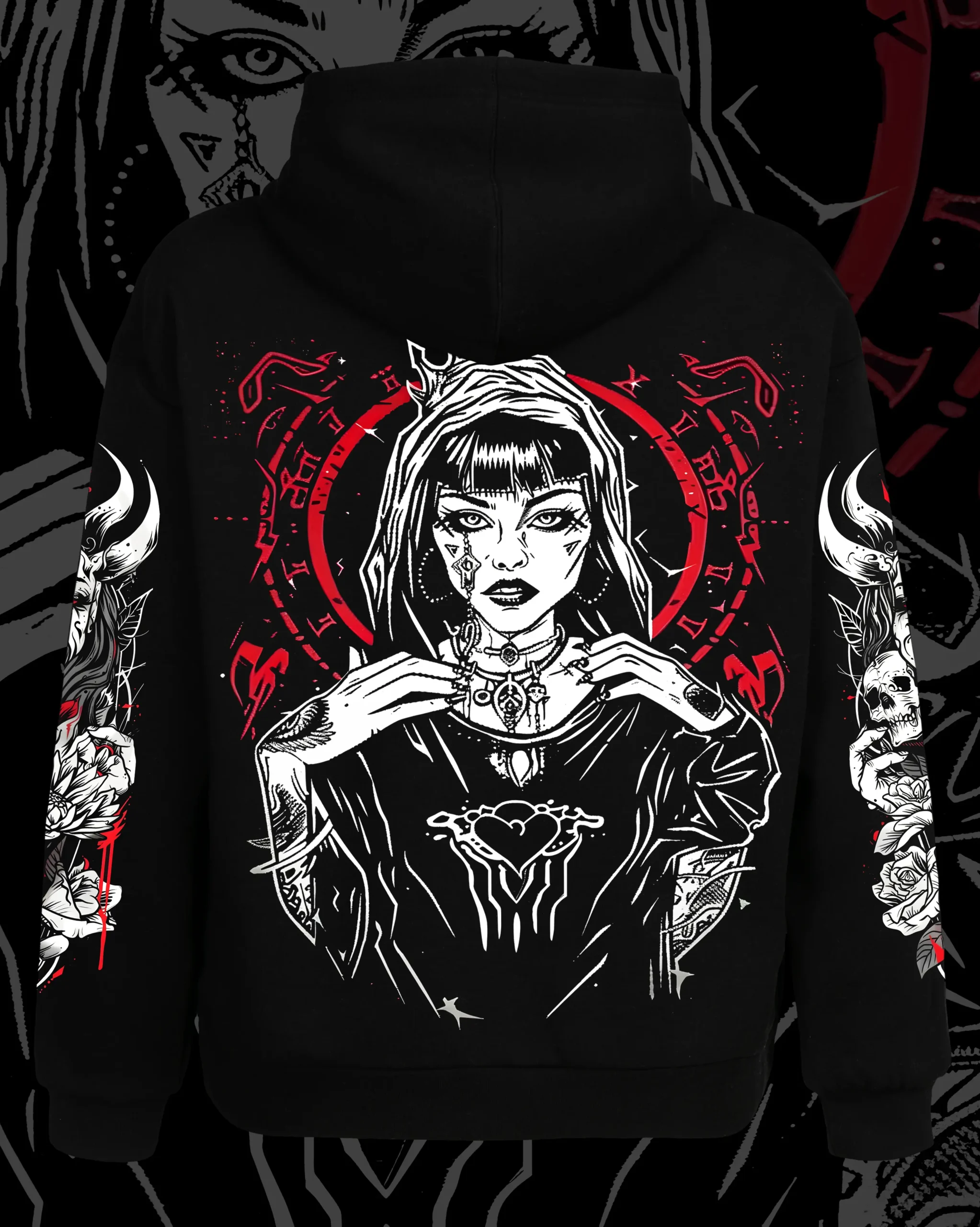 Ritual ink energy. That stare? Cuts through fake souls. Neck stacked in cursed charms, cloak drippin’ like black venom. Red seals blaze behind her like she’s conjuring chaos. This ain’t for trend hoppers—this drop’s for the marked. Limited as hell.