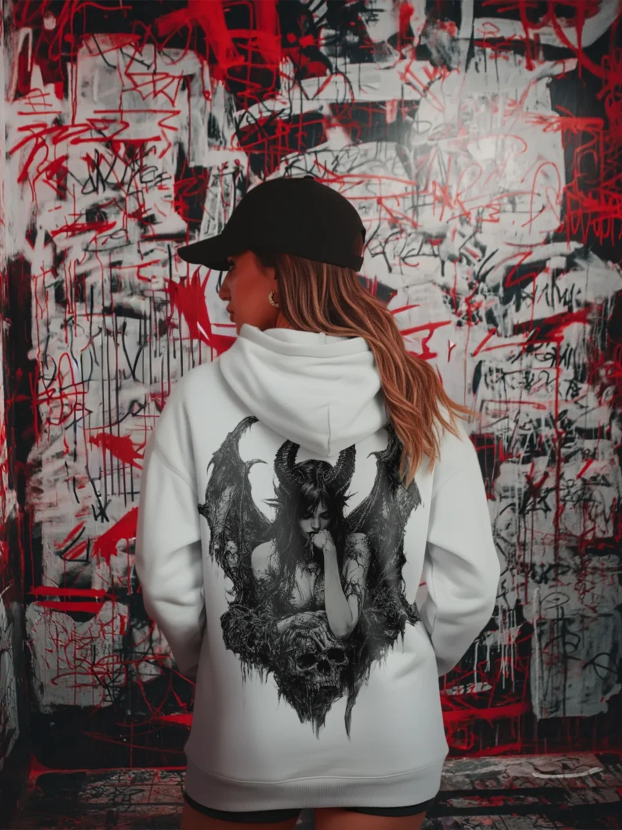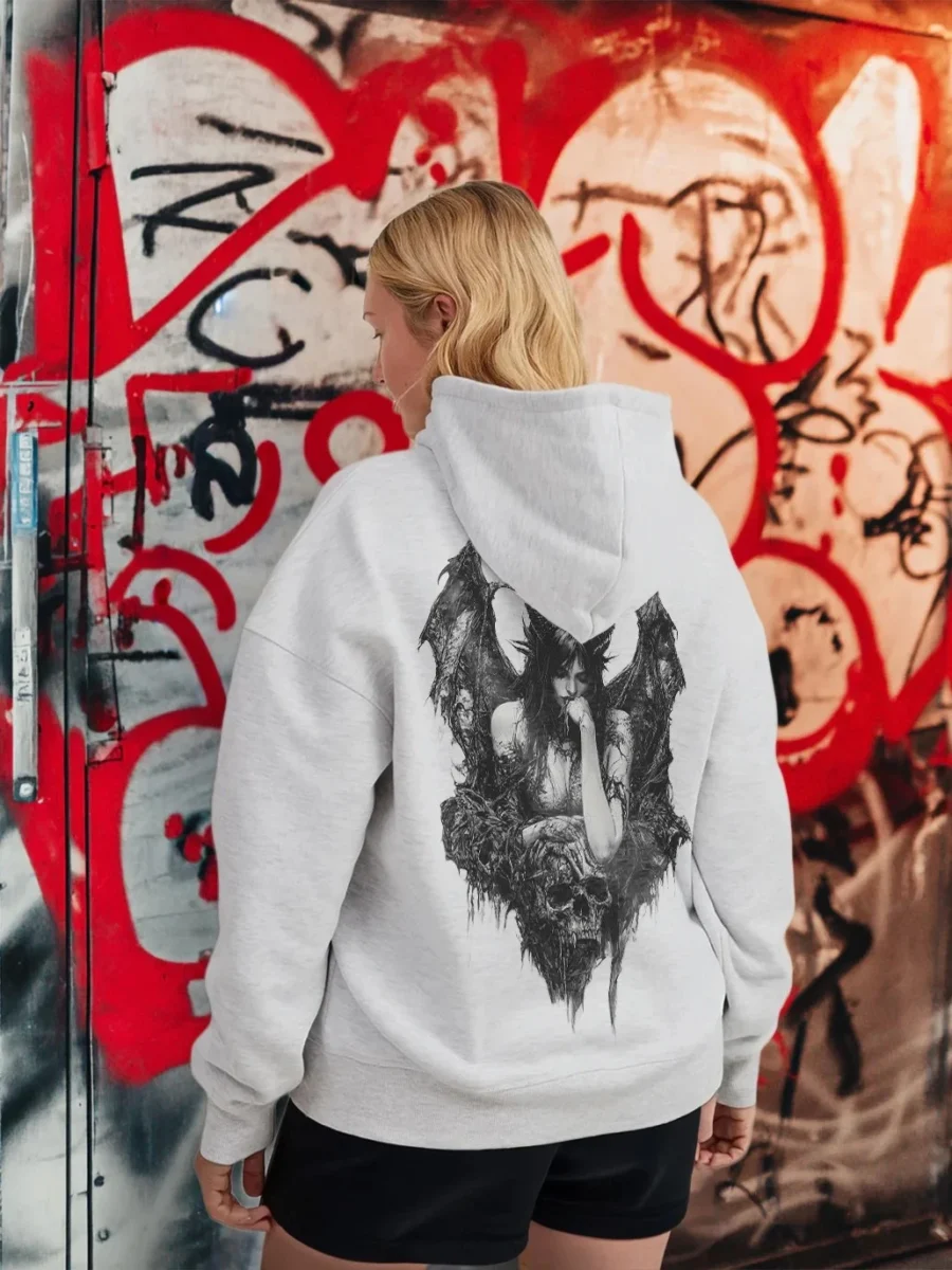 Lilith is depicted in a moment of pensive grace, her form seemingly rising from or entwined with dark, organic textures and resting upon a formidable, fanged skull. Every shadow and highlight is meticulously rendered in shades of black, white, and gray, creating a gothic masterpiece that commands attention. Details: