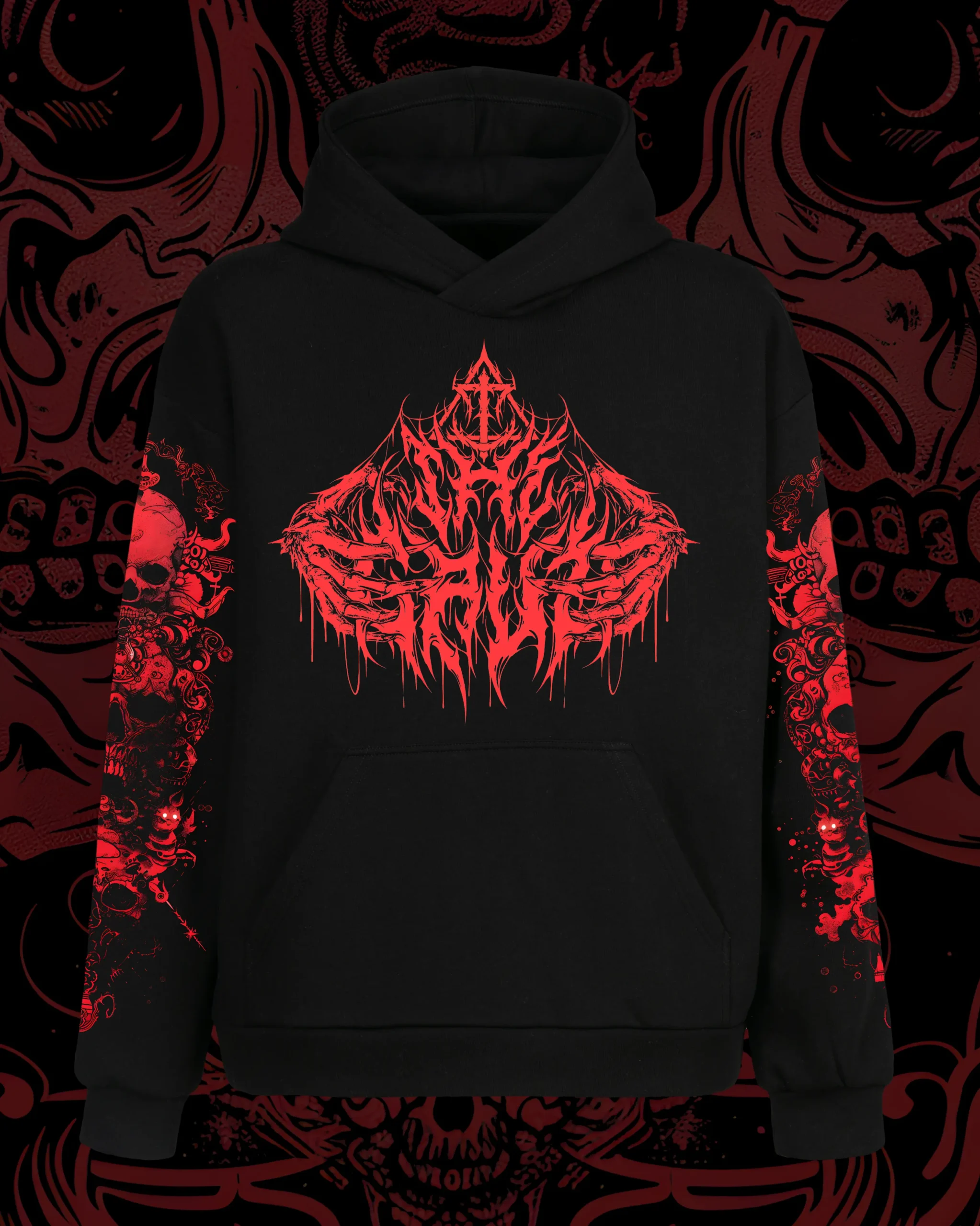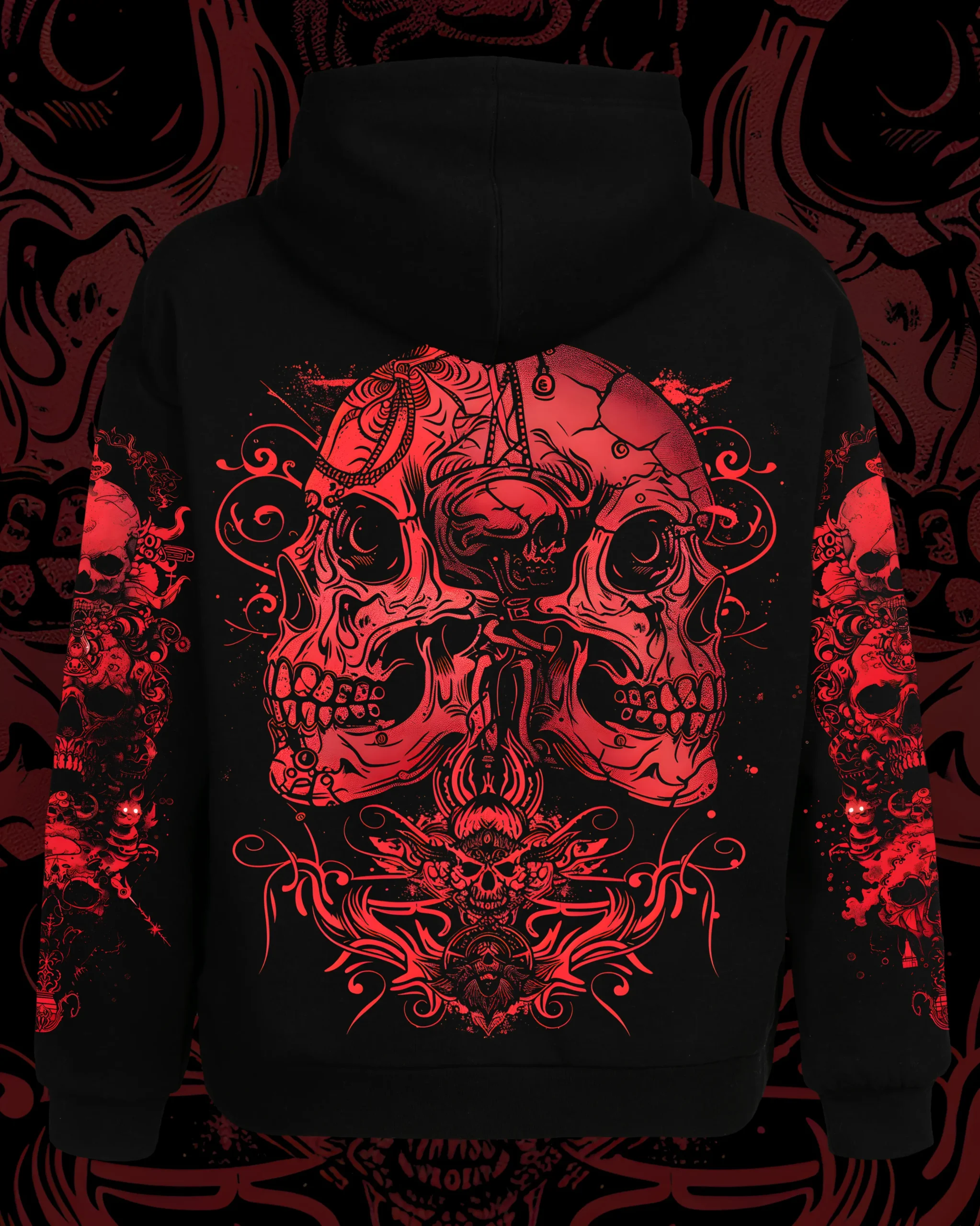 Two skulls fused into one, tangled in ornamental chaos and dark elegance. Every line reflects the other—raw, intense, and obsessively balanced. Crafted to stand out, this design hits hard with rare red detailing and high-impact print work. Not mass-made—just made to matter.