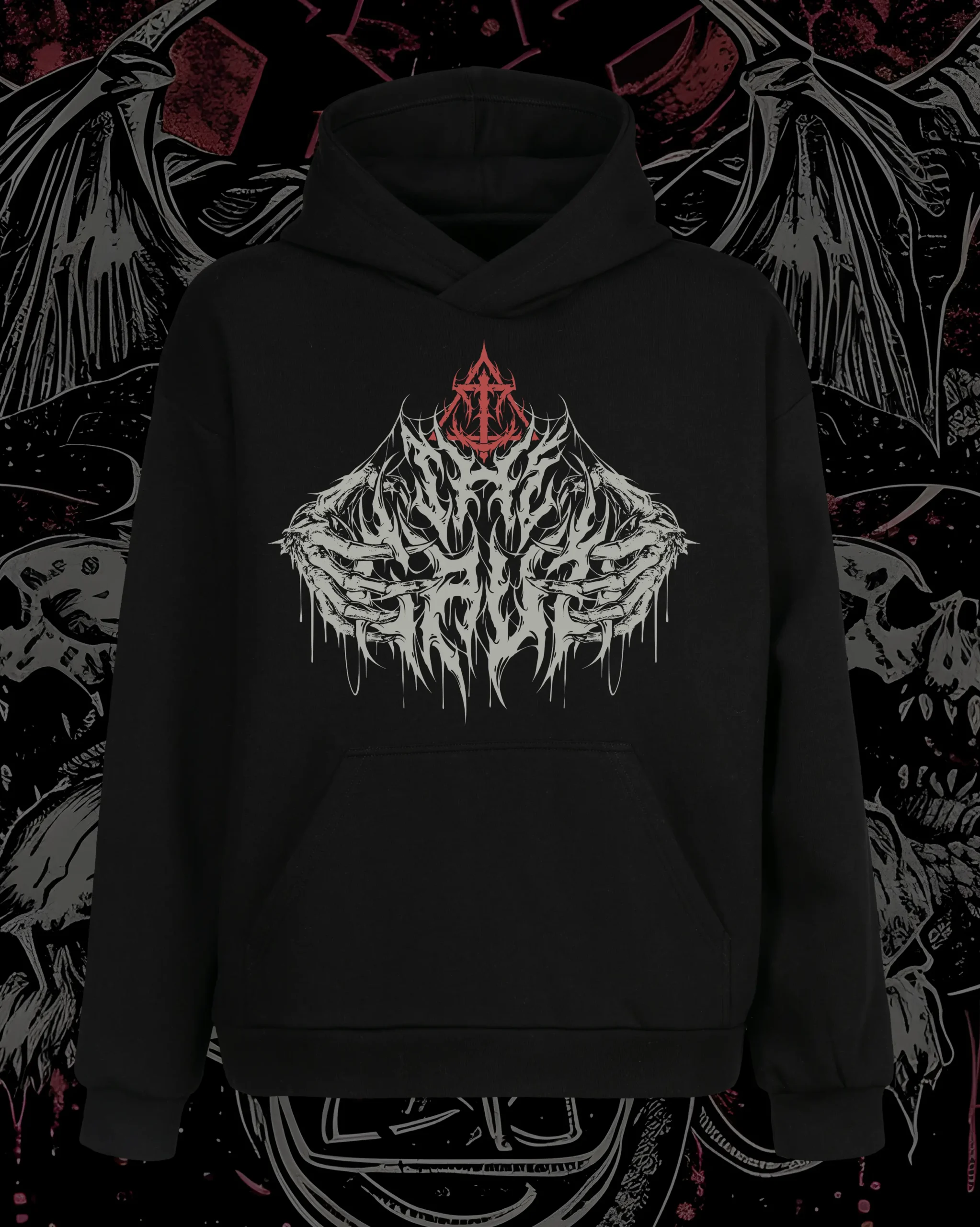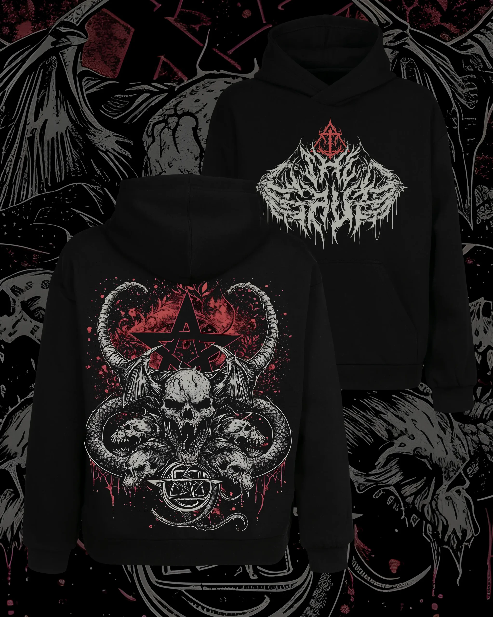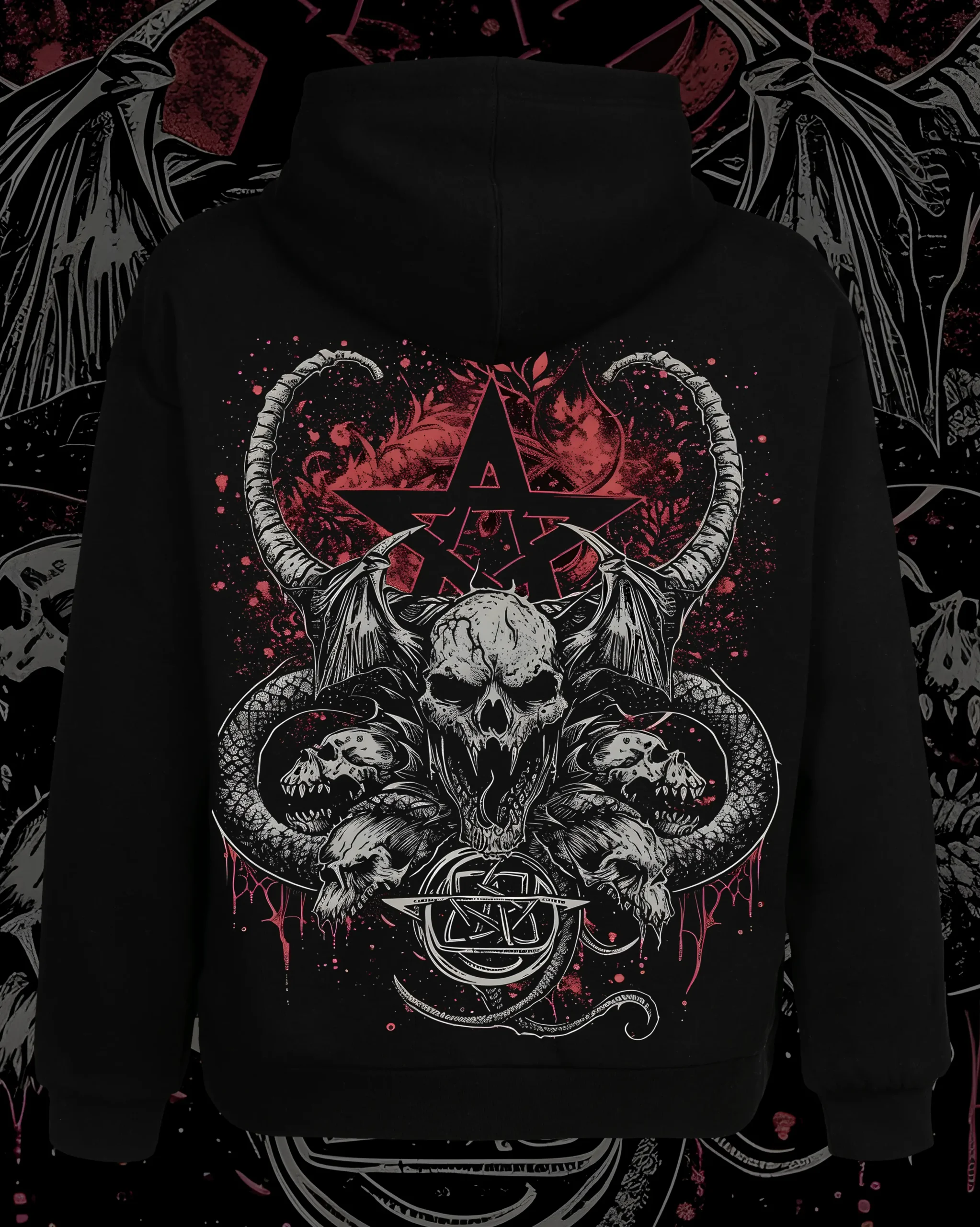 Serpents coil, skulls scream, and chaos takes form beneath the shadow of a star. “NightShade” is brutal elegance—loud, sharp, unforgettable. Only a handful will own this venom-laced piece. If you don’t fear standing out, this one’s yours.