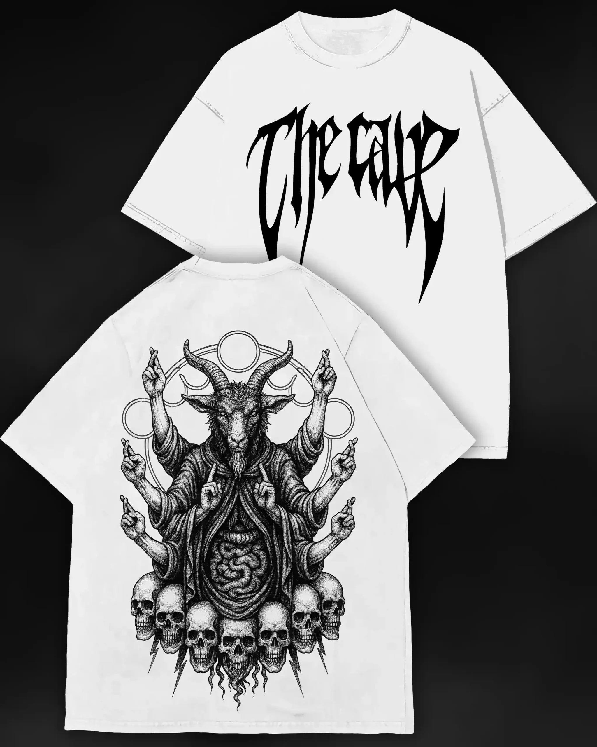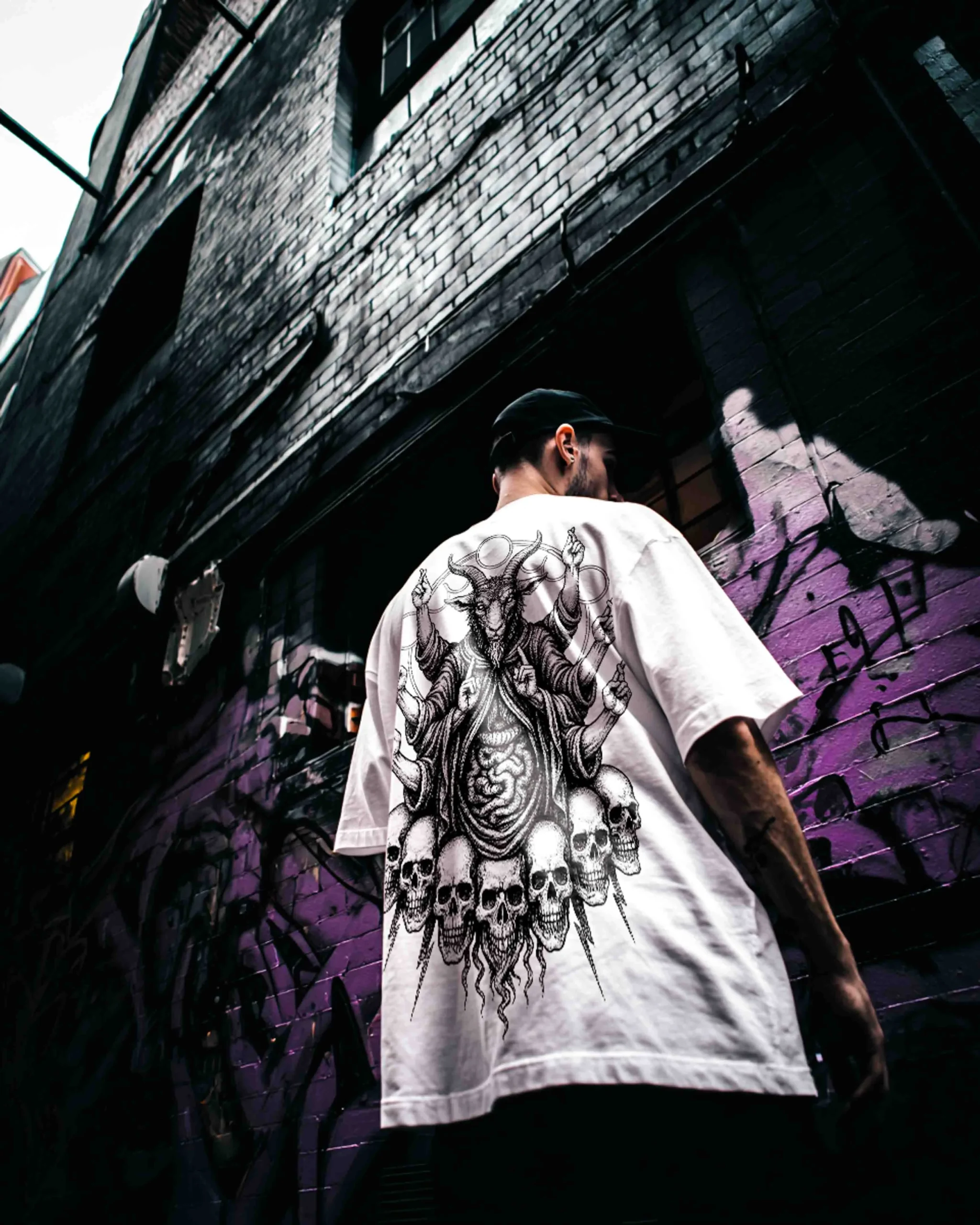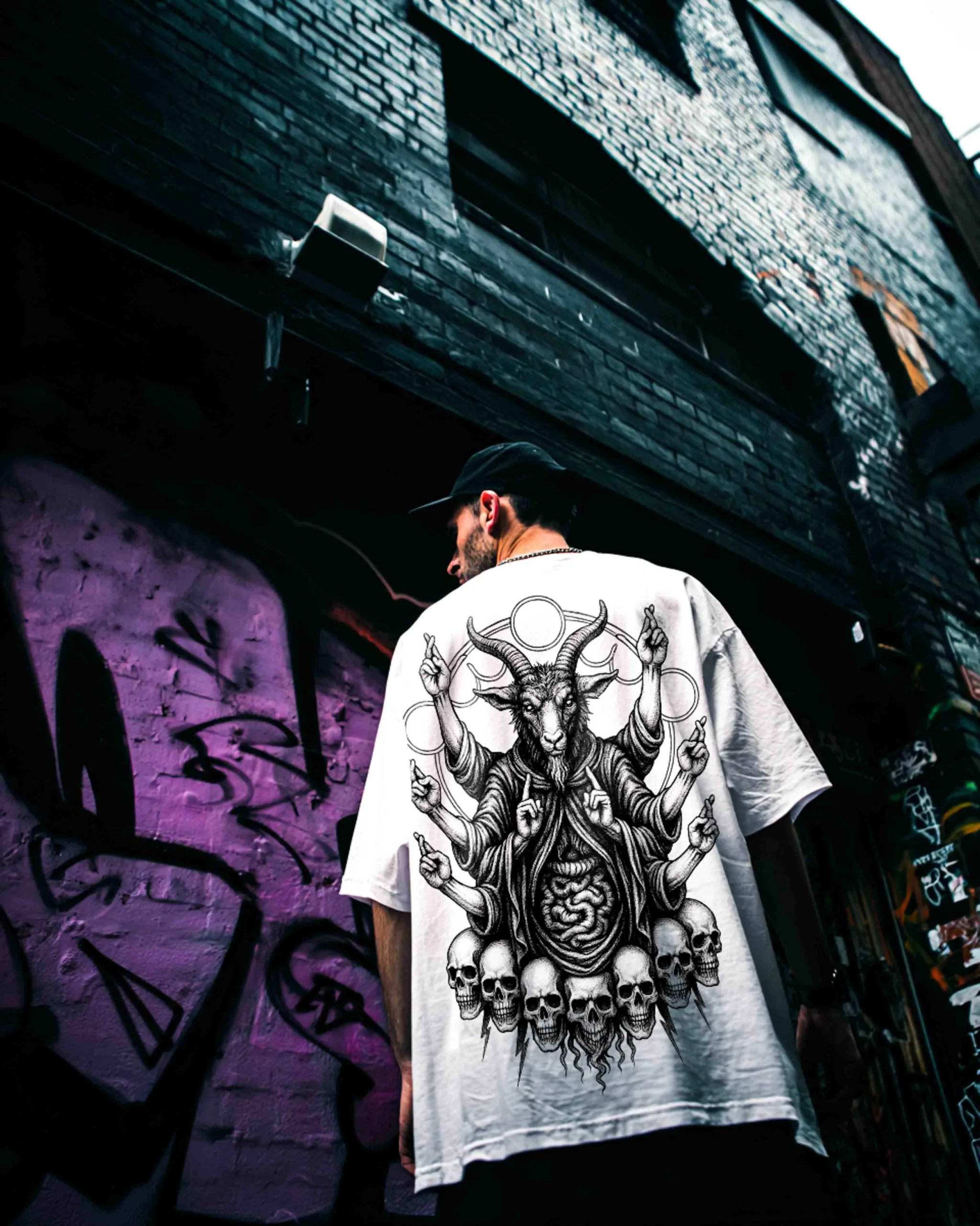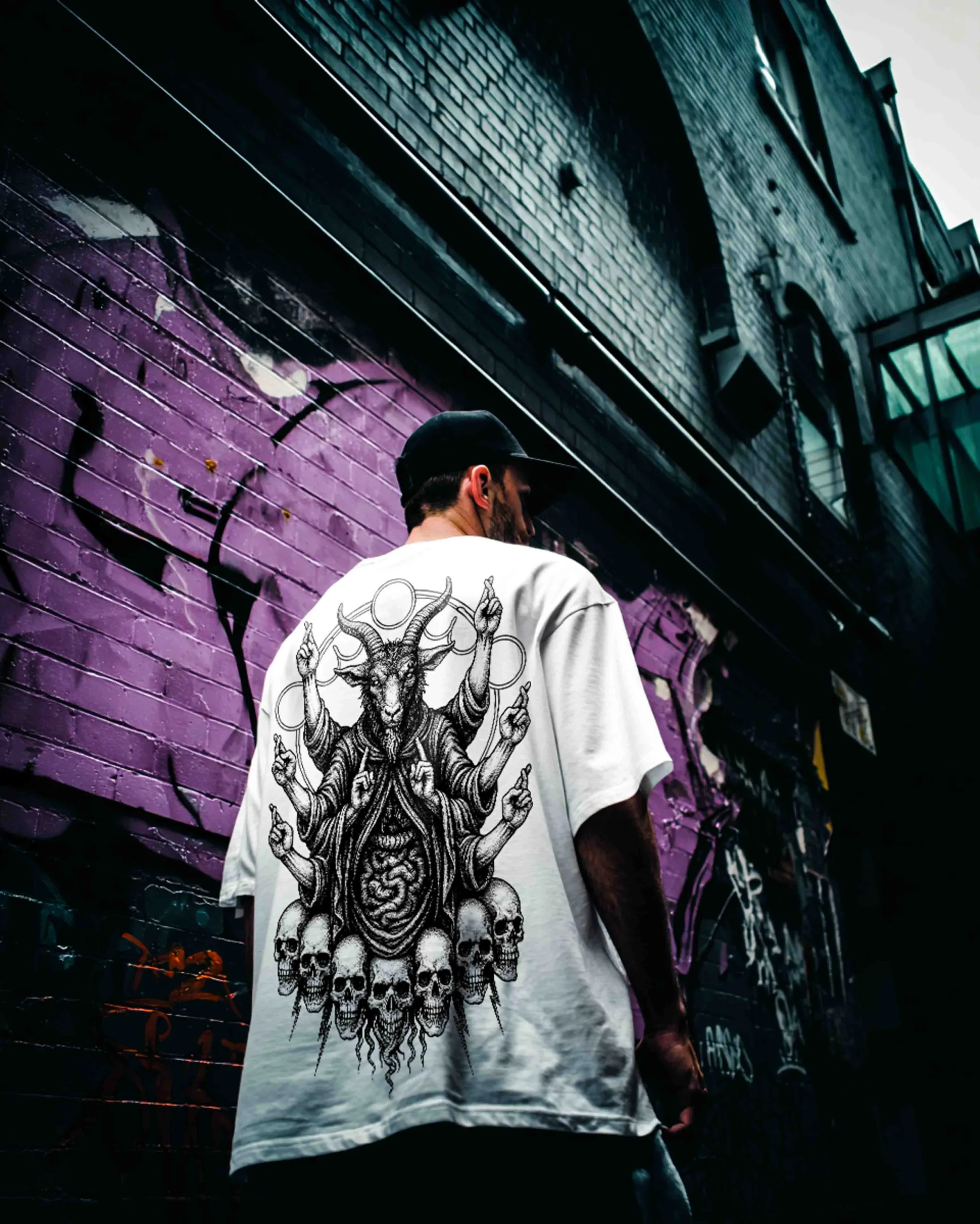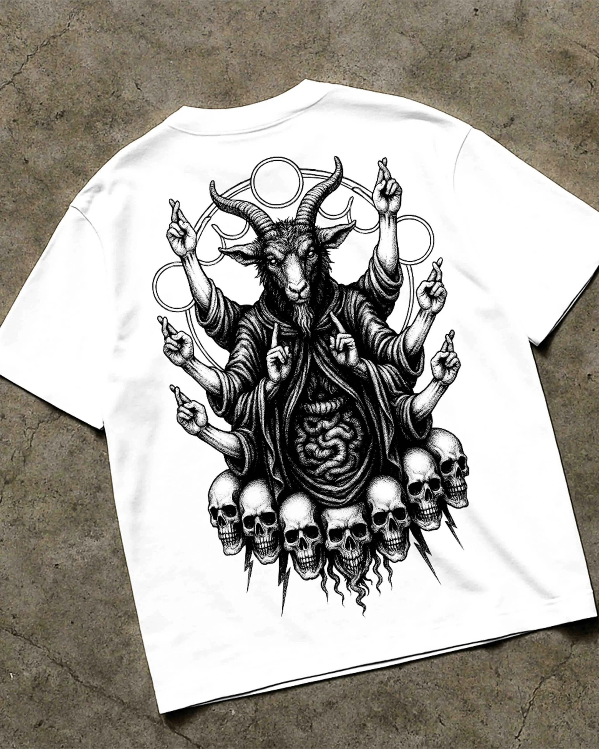 A multi-limbed goat deity surrounded by skulls and symbolism, printed in deep black on high-density cotton. Made for those who crave meaning in every thread — and presence in every room.