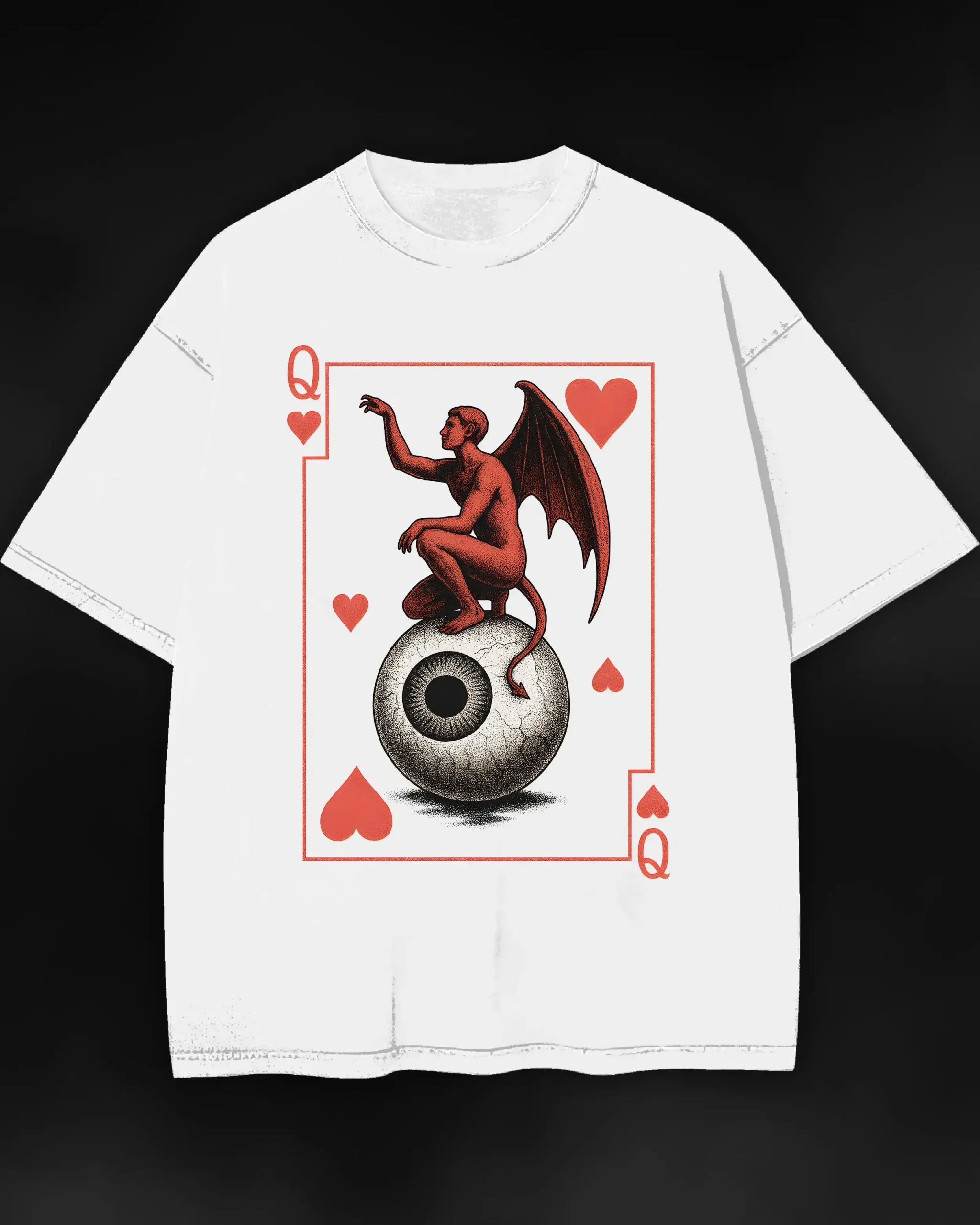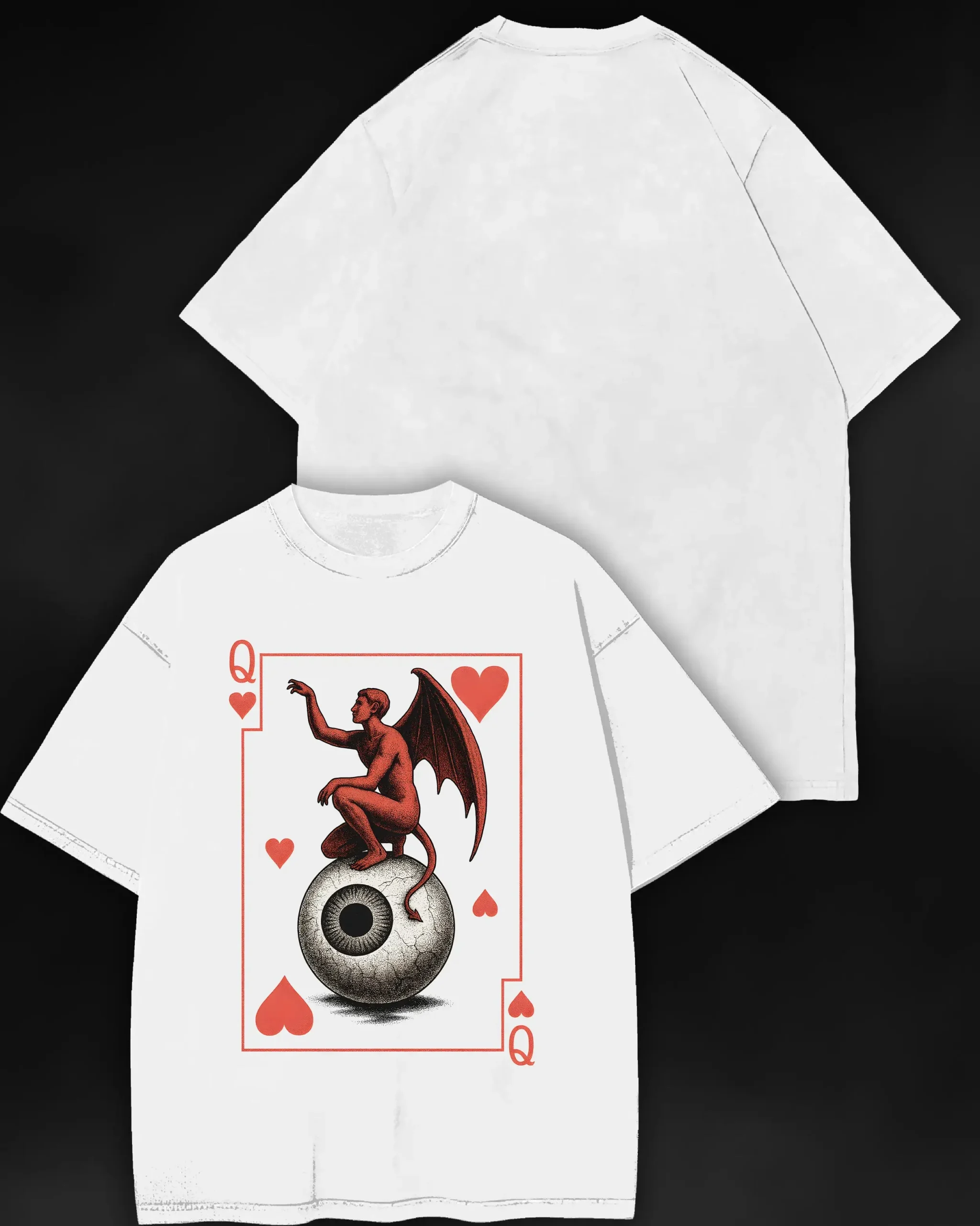 A devilish figure perches on an all-seeing eye, framed in hearts and irony. Printed with crisp detail on luxury-grade cotton — made to turn heads, spark questions, and say everything without saying a word.