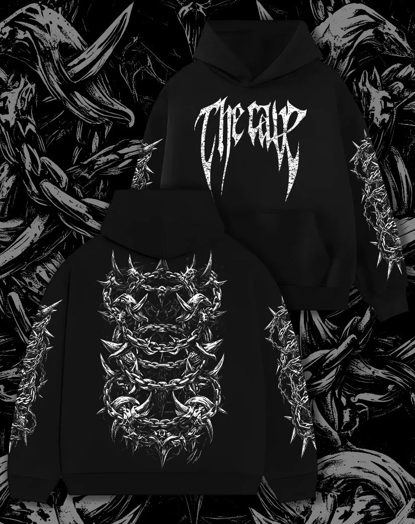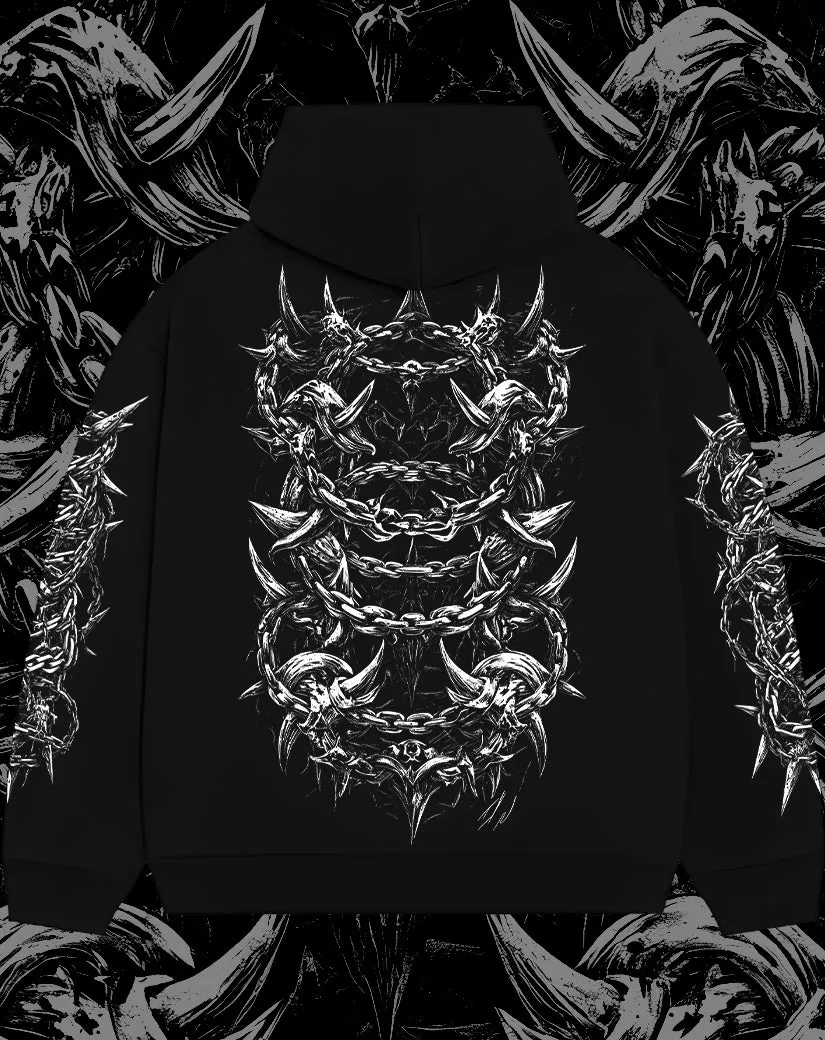 Barbed chains wrap across the body and sleeves with razor-sharp detail. The thick-knit fabric adds weight and structure, giving the piece a sculpted feel — made for those who like their streetwear bold, brutal, and built to last.
