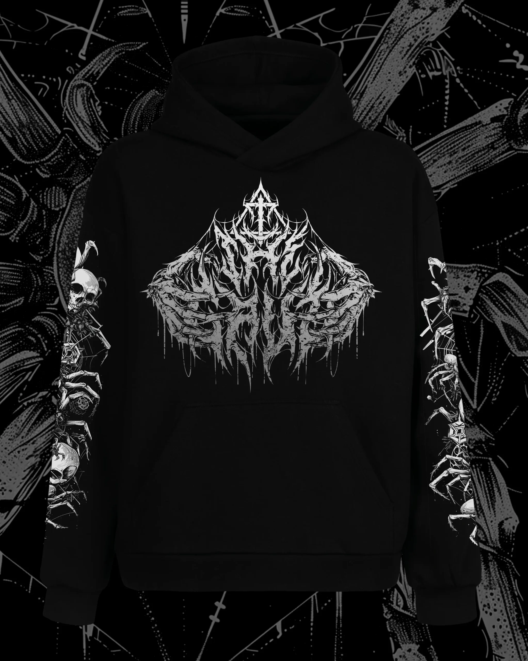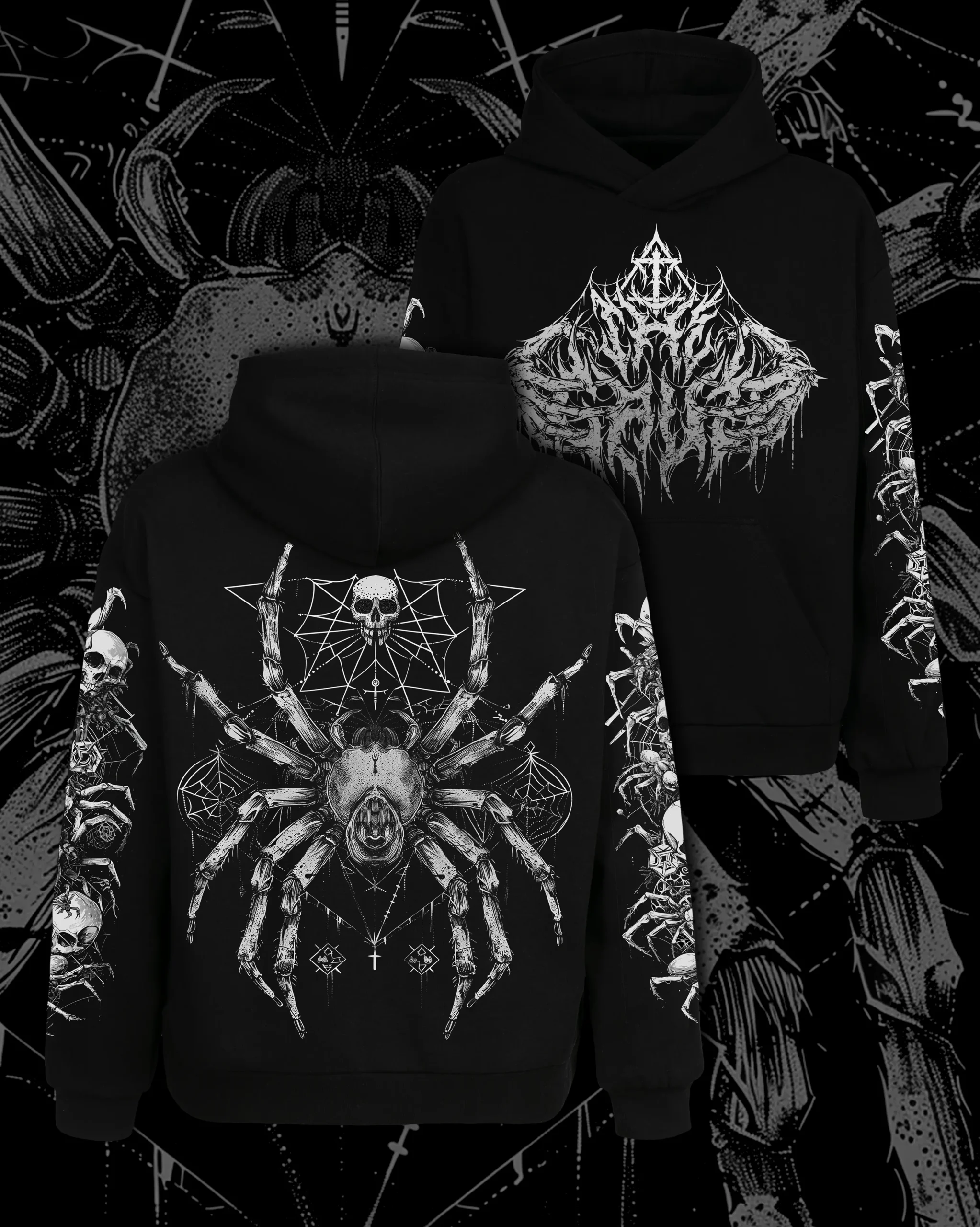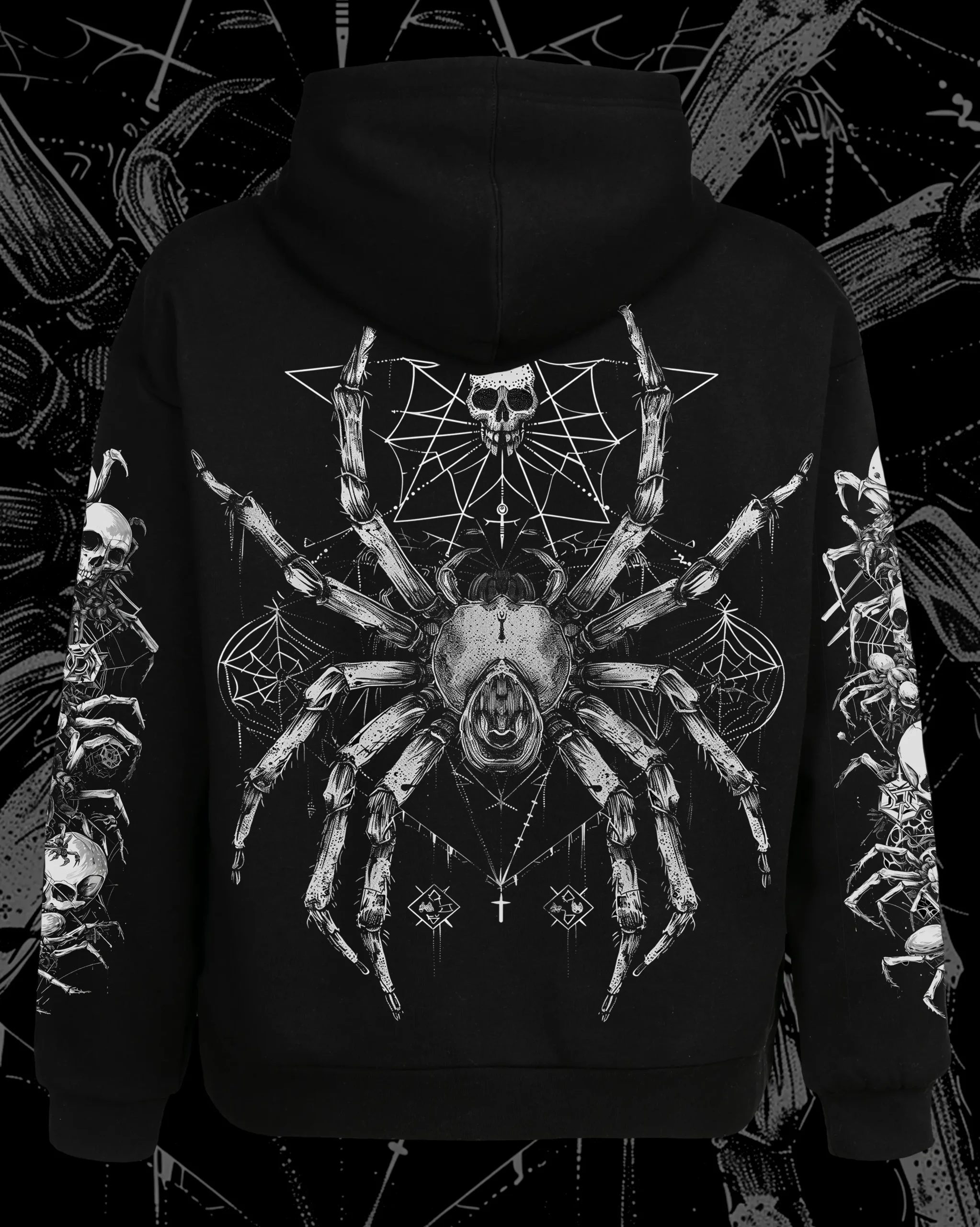 “Venom” strikes with deadly symmetry—an intricate tarantula webbed in occult geometry and symbolic power. Designed for those who crave bold detail and premium execution. It’s not just a hoodie—it’s a statement crafted for the fearless, limited for the chosen.