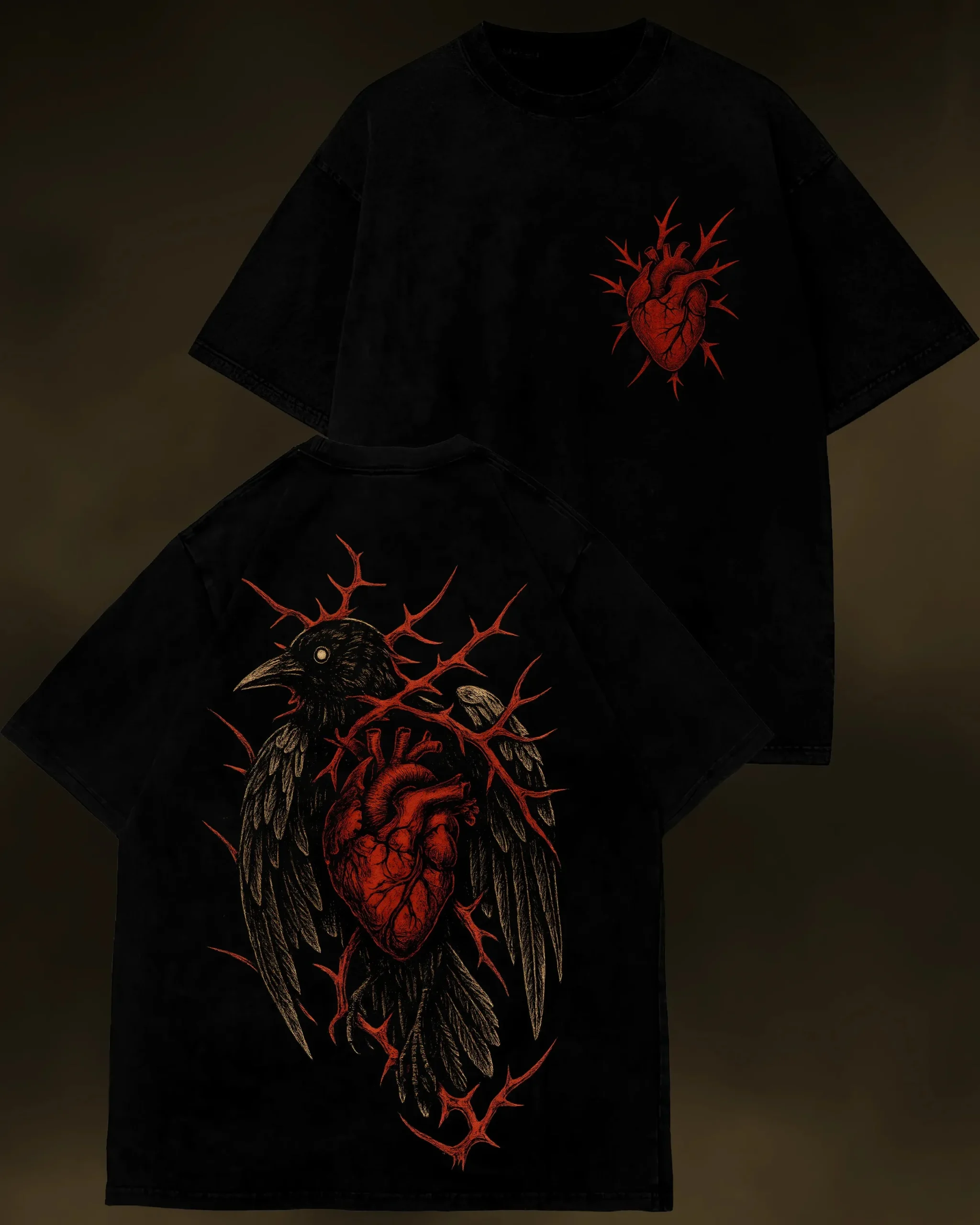 A pierced heart wrapped in wings and thorns, printed in vivid detail on thick, premium cotton. Not just wearable — it’s a statement. Quiet. Brutal. Unmistakable.